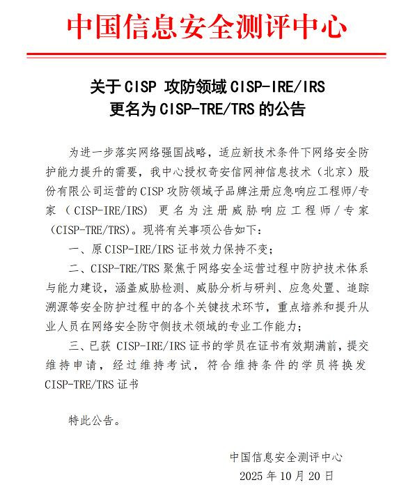 为进一步落实网络强国战略,适应新技术条件下网络安全防护能力提升的需要,我中心授权奇安信网神信息技术(北京)股份有限公司运营的CISP攻防领域子品牌注册应急响应工程师/专家( CISP-IRE/IRS)更名为注册威胁响应工程师/专家(CISP-TRE/TRS)。现将有关事项公告如下: